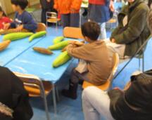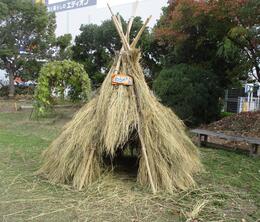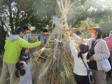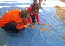 キッズパークの田んぼで収穫したわらを使ってしめ縄作りを行いました。わらをたたいて編むところから始めました!