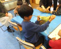 はっぱのスタンプでは、じぶんではっぱを選んできました!そして、はっぱに絵の具をぬりぬり。みんな真剣にぬっています。