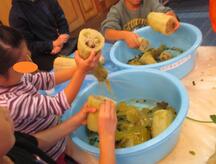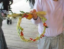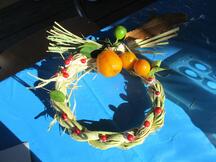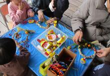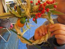 キッズパークの木の枝やつるをつかってリースにして、園内のどんぐりやふうせんかずら、千日紅などの植物で彩りました。子どもたちが自由に考えて形にしていき、かわいいリースがたくさんできあがりました!