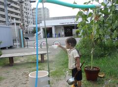 あさがおやひまわりにお水をやってくれています。