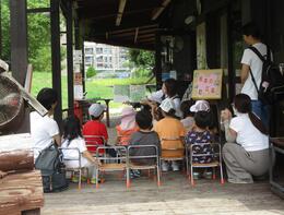 キッズパークの田んぼには、小さな小さなかえるがいます。のぞいてみてね。