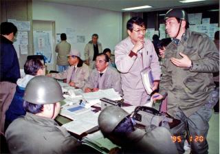 1月17日午前7時5分、市長を本部長とする災害対策本部を設置し、救命救助活動を最優先に活動を開始した。発災から20分、防災対策課の職員が登庁し対策本部を2階会議室に設定して、市民、警察、消防、消防団、職員からの災害通報の受付を開始したのは6時30分だった。昼前には自衛隊も加わり、対応に終われて室内は混乱を極めた。本部会議は別の会議室を整え、情報と指示の集約を行った。