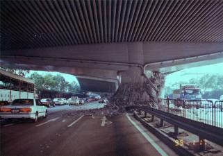 写真は、橋脚に進路を阻まれ直前で止まったトラック、下敷きとなり身動きが取れなくなったコンテナトラックが停まっている。今にも崩れそうな高速道路の下を、避難する乗用車やバイクが通りすぎる。