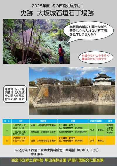 | 内容 | ミニ講座(30分)+現地見学(3時間) 史跡や石垣の講座を聴講し、現地に残された石垣用の石材などを見学します。 | 現地見学(3時間30分) 東六甲で採石していた鍋島家の実際の工事場所や刻印石広場など、供給地である大坂城石垣を見学します。 |
