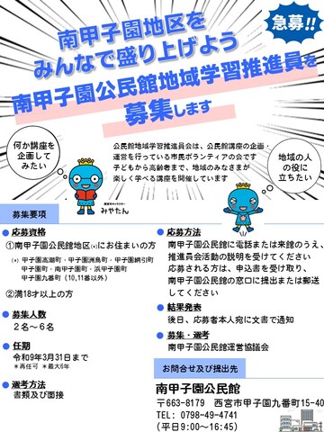 南甲子園公民館 (電話)0798-49-4741 ※平日、午前9時~午後4時45分まで