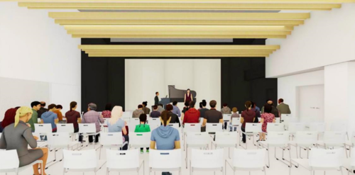 ◆ホールは広い舞台袖や控え室を確保し、音響性能を向上。鏡を設置