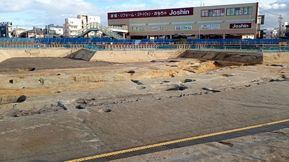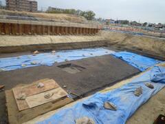 本発掘調査は長期におよぶため2期に分けて行う予定です。本発掘調査(1期)が令和7年8月から開始しました。土留め等の仮設物を設置し、これから本格的な調査が実施されます。