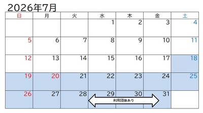 7月の「利用団体あり」の期間は、前宿泊室の半分程度の空きがあり宿泊予約可能です。同期間は「グラウンド」の使用は可、「体育室」の使用は不可。