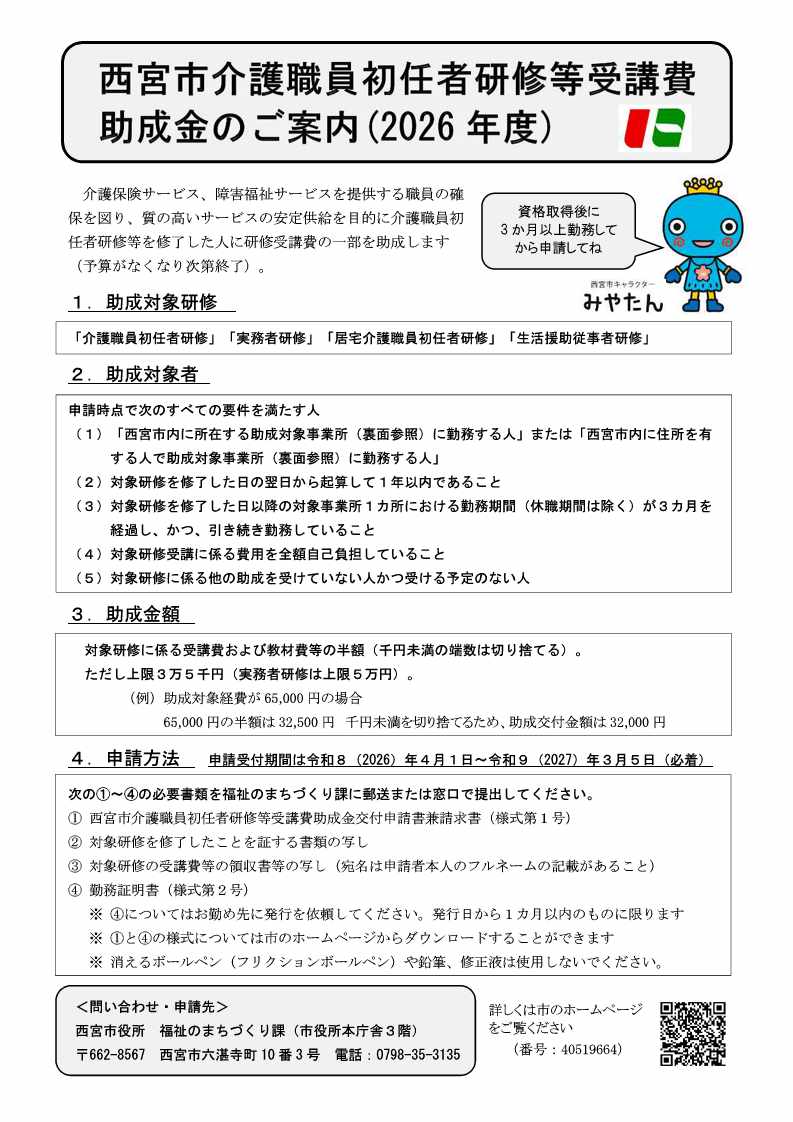 西宮市介護職員初任者研修等受講費助成金のご案内チラシ(PDF:730KB)