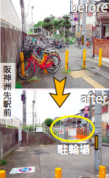 阪神洲先駅前に駐輪場を設置した結果、駅前の放置自転車の台数が減りました。1931台(原動機付自転車157台を含む)の自転車が駐輪できる「阪急西宮北口北東第1駐輪場」をはじめ、市内71カ所の駐輪場を運営しています。