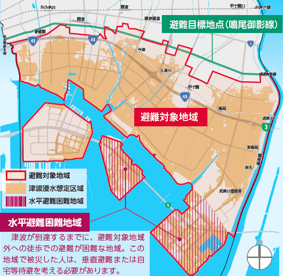 津波から命を守るためには、より早く安全な場所へ避難することが何よりも大事です。しかし、適切な避難方法は皆さんの置かれている状況や地域特性によって異なります。市民や地域団体、事業所などの皆さんが、“いのちを守る”ため、適切な津波避難の方法を自ら考えてもらえるように、3種類の避難方法を示した「西宮市津波避難行動指針」を策定しました。
