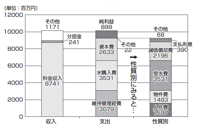 平成28年度の収益的収支(水道水を作るための収入と支出)は、収入101億5300万円、支出92億6500万円で、差し引き8億8800万円の黒字でした(下グラフ参照)