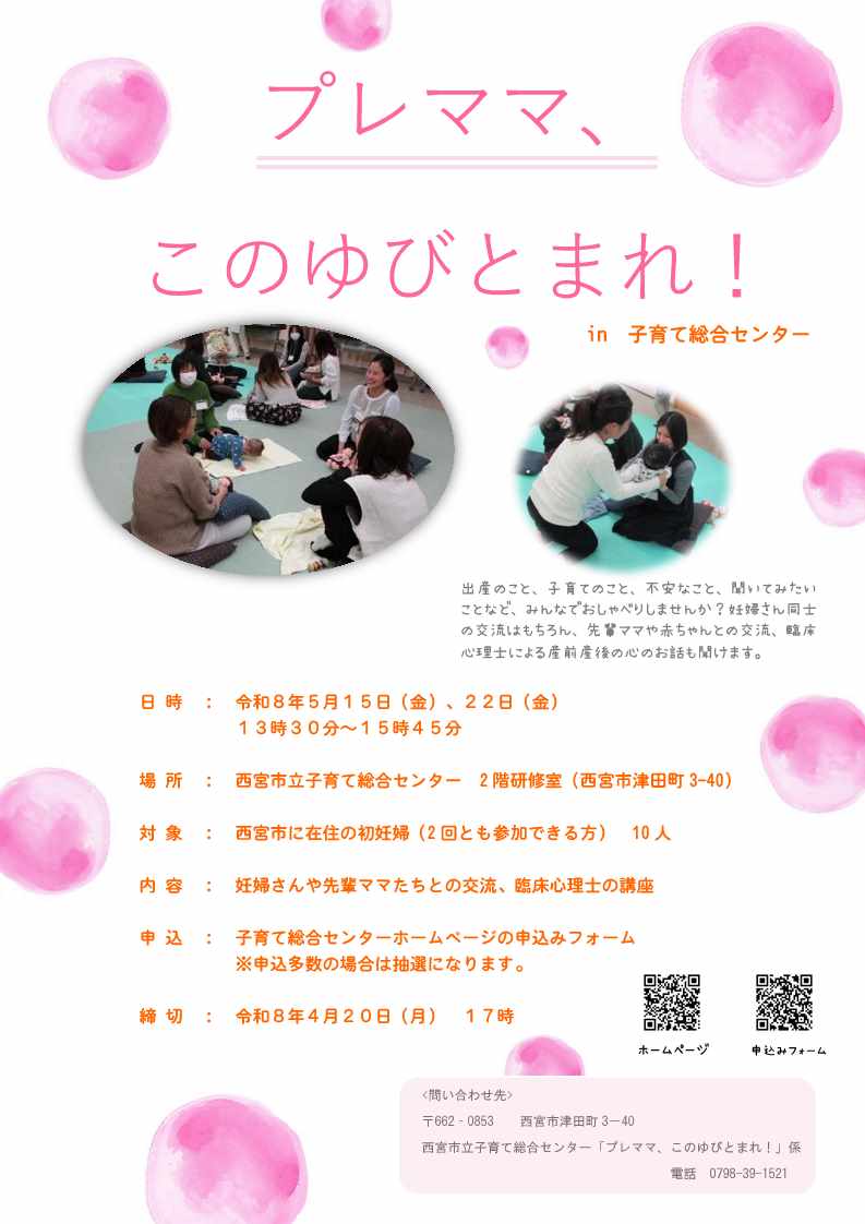 ・2026年5月15日(金曜日)13時30分~15時45分 | 西宮市内在住の初妊婦 10人 | 2026年4月20日(月曜日)17時 |