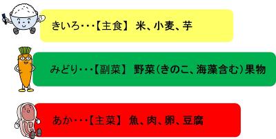 きいろ、みどり、あかの食品をそろえて食べるようにしましょう。