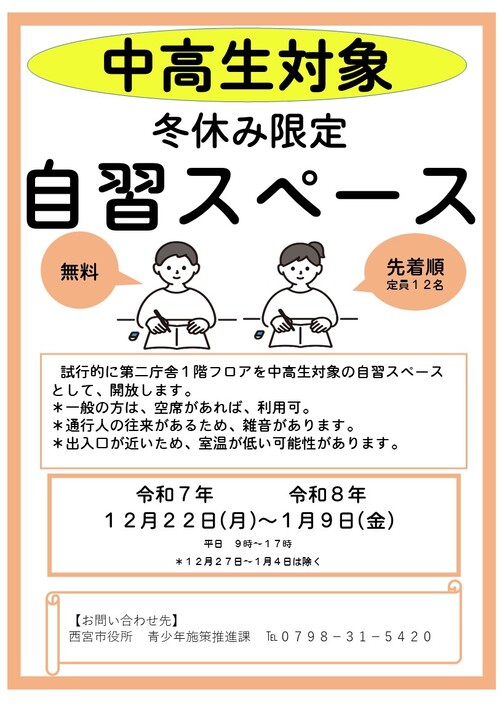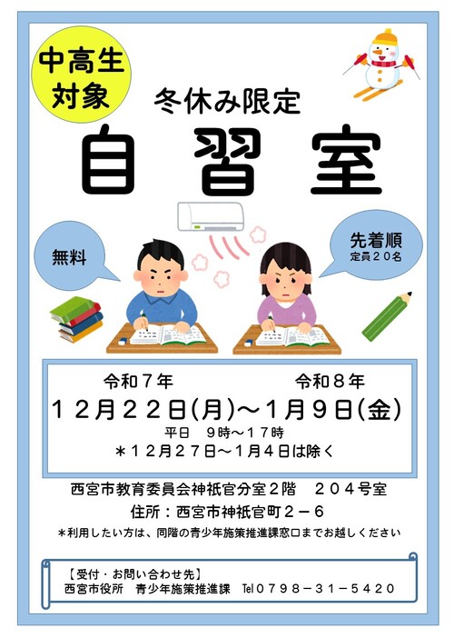 各施設により、開設日時等が異なるため、詳細はこちら【中高生限定】冬休み期間 市内各所で自習室を開設します