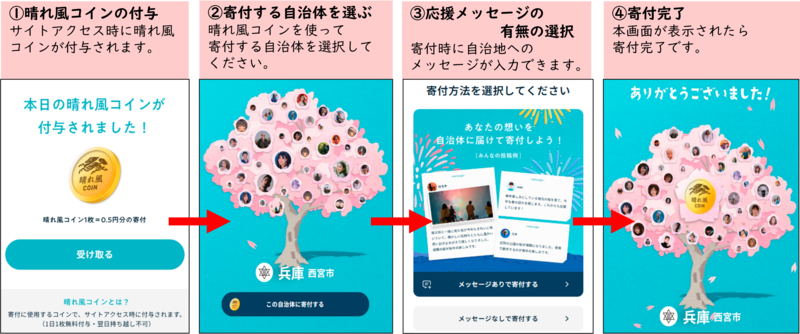 “晴れ風コイン”とは、特設サイトにアクセスすると一日一回無料でゲットできるコインのことで、好きな自治体に