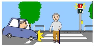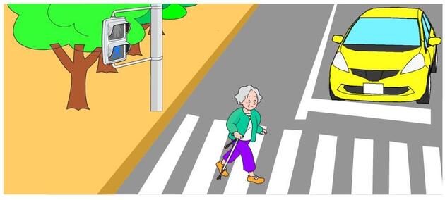 青信号の途中から渡り始めると、横断の途中で赤信号になったり、急いで右・左折してくる車がいるかもしれません。安全のため、次の青信号まで待ってから横断する心のゆとりを持ちましょう。