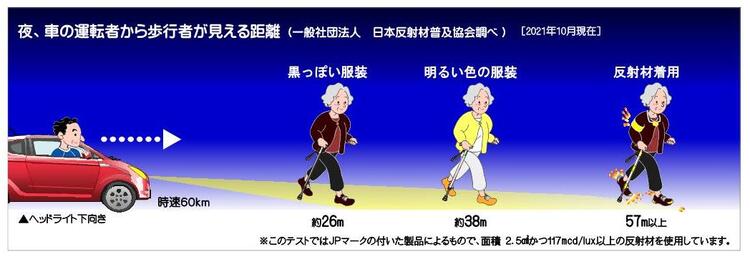 反射材やLEDライトを活用し、明るい色の服装で、暗くなっても車からよく見えるよう自分を目立たせましょう。