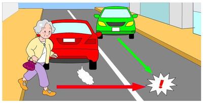 止まっている車の前や後ろ、通り過ぎた車のすぐ後ろを横断すると、その車が視野をさえぎるため、ほかの車が近づいてきても見えないことがあります。「横断後半」で左から走行してくる車と衝突する事故が多く発生しています。