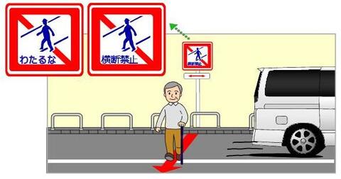 「歩行者横断禁止」の標識のあるところでは、歩行者は横断をしてはいけません。