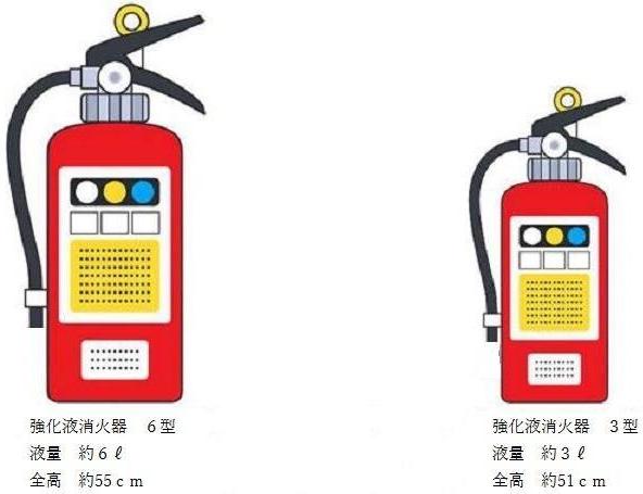 強化液消火器6型は液量約6リットル、全高約55センチです。3型は、液量約3リットル、全高約51センチです。