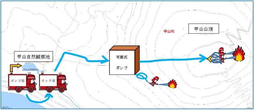 長距離ホース延長を行い、道中の飛び火に対して消防団により放水、最後に甲山山頂の火点に放水するという訓練内容でした。
