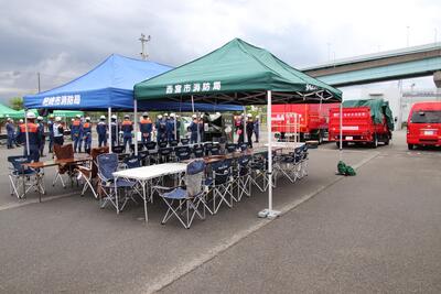 後方支援活動とは、災害現場で活動している隊員の支援を行うことで宿営地でのエアーテント設営、活動隊員の食事を作る炊き出しなどを実施しています。後方支援活動は兵庫県一体で活動するため、各消防本部と連携を図る必要があり、今回の訓練を通じて阪神ブロックで一体となった後方支援体制を構築することができました。