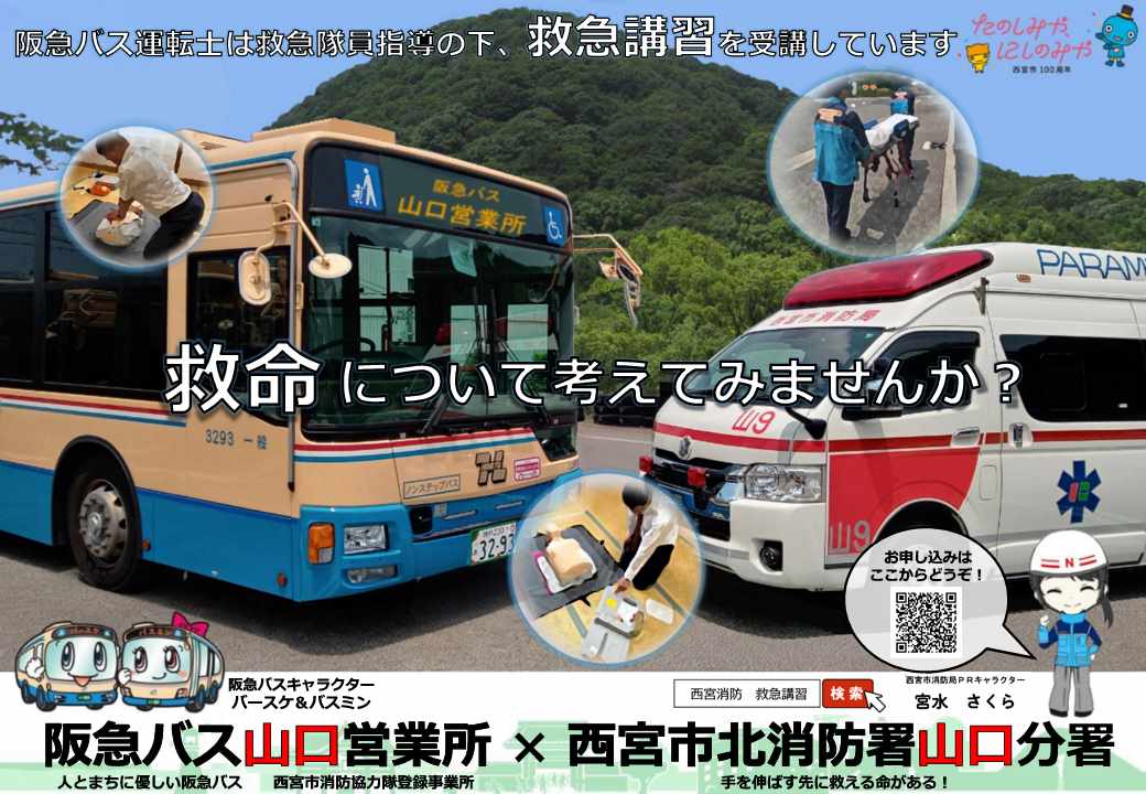 本ポスターは、北消防署山口分署と「人とまちに優しい」を企業理念とする阪急バスが「コラボ」し、消防署と管内の企業が合同で応急手当普及啓発の広報を行ったものです。阪急バスと救急車のコラボをぜひご覧ください!