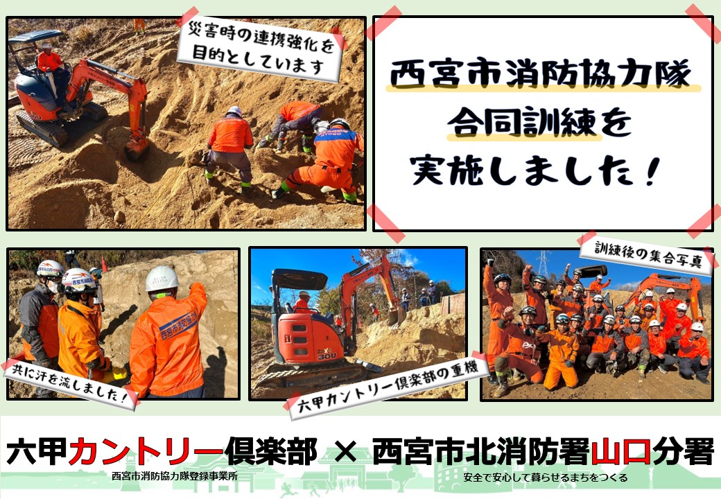 この訓練は消防機関と西宮市消防協力隊の連携強化を目的として、消防隊員16人、六甲カントリー倶楽部2人が参加し、土砂災害を想定した救助訓練を合同で実施しました。