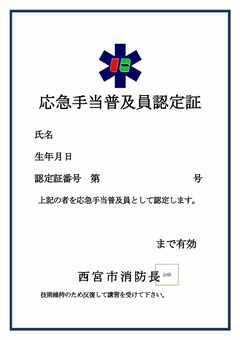 | 5 | 西宮市以外で普及員資格を取ったのですが? | 消防庁の実施要綱に基づく講習であると認められれば、本市で認定を受けた方と同じ扱いになります。 |