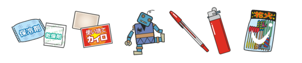 • 保冷剤、カイロ、花火(水で濡らす)、金属の混ざったプラスチック製のおもちゃ、文房具、ライターなど