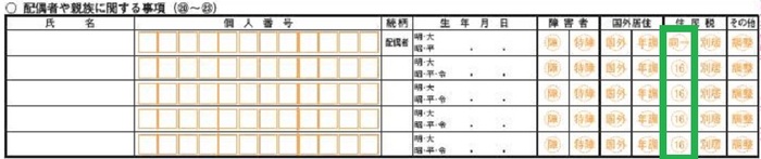 同一生計配偶者の場合は「住民税」列の“同一”に〇印を記入してください。