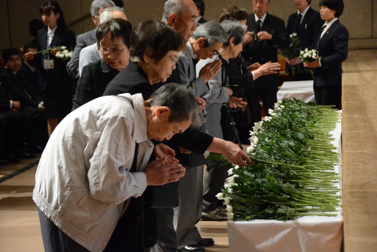 最後に、出席者を代表して石井市長らが献花。続いて出席者全員が順番に白い菊の花を献花し、戦没者らを追悼しました。