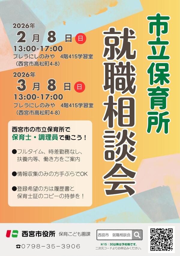 【市立保育所】西宮市・市立保育所の就職相談会の開催 ~公立保育所で働こう!~