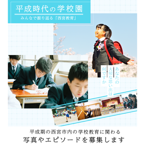 | 西宮市教育委員会では、西宮市100周年を祝い、またその後の未来へと先人の思いをつなげていくために『平成教育史(資料編)』を作成します。この中では、平成年間の西宮教育の様子をまとめるとともに、学校園の思い出をふりかえるページも予定しています。つきましては市民のみなさまからの写真やエピソードを募集したいと考えています。 |
