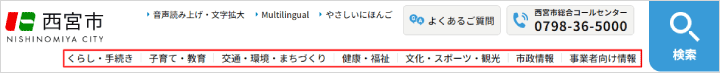 当サイトの情報は、基本的に「くらし・手続き」「子育て・教育」「交通・環境・まちづくり」「健康・福祉」「文化・スポーツ・観光」「市政情報」「事業者向け情報」に分類し提供しています。