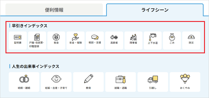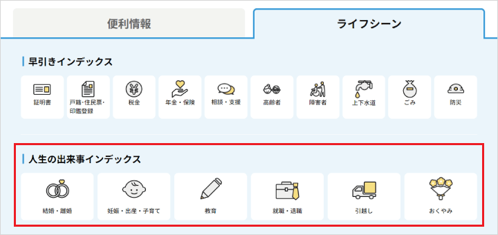ページ上部にある「便利情報」から「ライフシーン」にタブを切り替えいただくと、人生の出来事インデックスをご確認いただけます。
