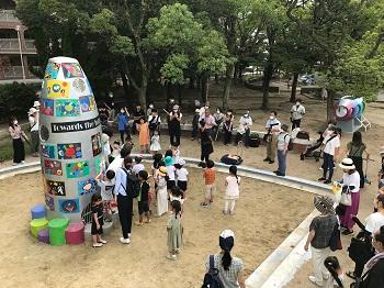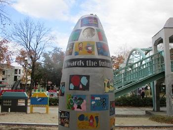 スペースシャトル型遊具については、大手前大学からこどもたちの絵を再現塗装する改修をご提案いただき、小学生1年生以下のこどもを対象とした「宇宙の絵」の作画を募集いただきました。応募があった43名のこどもたちの絵がスペースシャトルの表面に再現され、令和4年8月には除幕式も開催され、こどもたちや保護者の方々にご参加いただきました。