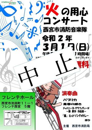 令和2年3月1日(日曜日)に西宮市フレンテホールで、西宮市消防音楽隊「火の用心コンサート」を開催予定でしたが、新型コロナウイルスの感染が広がっている状況を受け、開催を中止することといたします。